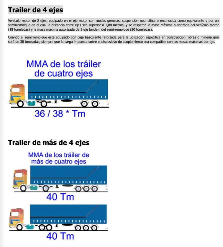 Cuando el semirremolque esté equipado con caja basculante reforzada para la utilización específica en construcción, obras o minería que será de 38 toneladas, siempre que la carga impuesta sobre el dispositivo de acoplamiento sea compatible con las masas máximas por eje.