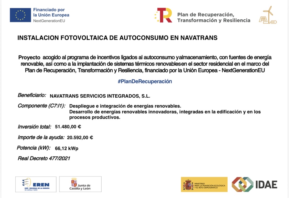 Para ello nos hemos acogido al Programa de incentivos ligados al autoconsumo y almacenamiento con fuentes de energía renovable, del Ente Público Regional de la Energía de Castilla y León, en el marco del Plan de Recuperación, Transformación y Resiliencia, financiado por la Unión Europea – Next Generation EU.
